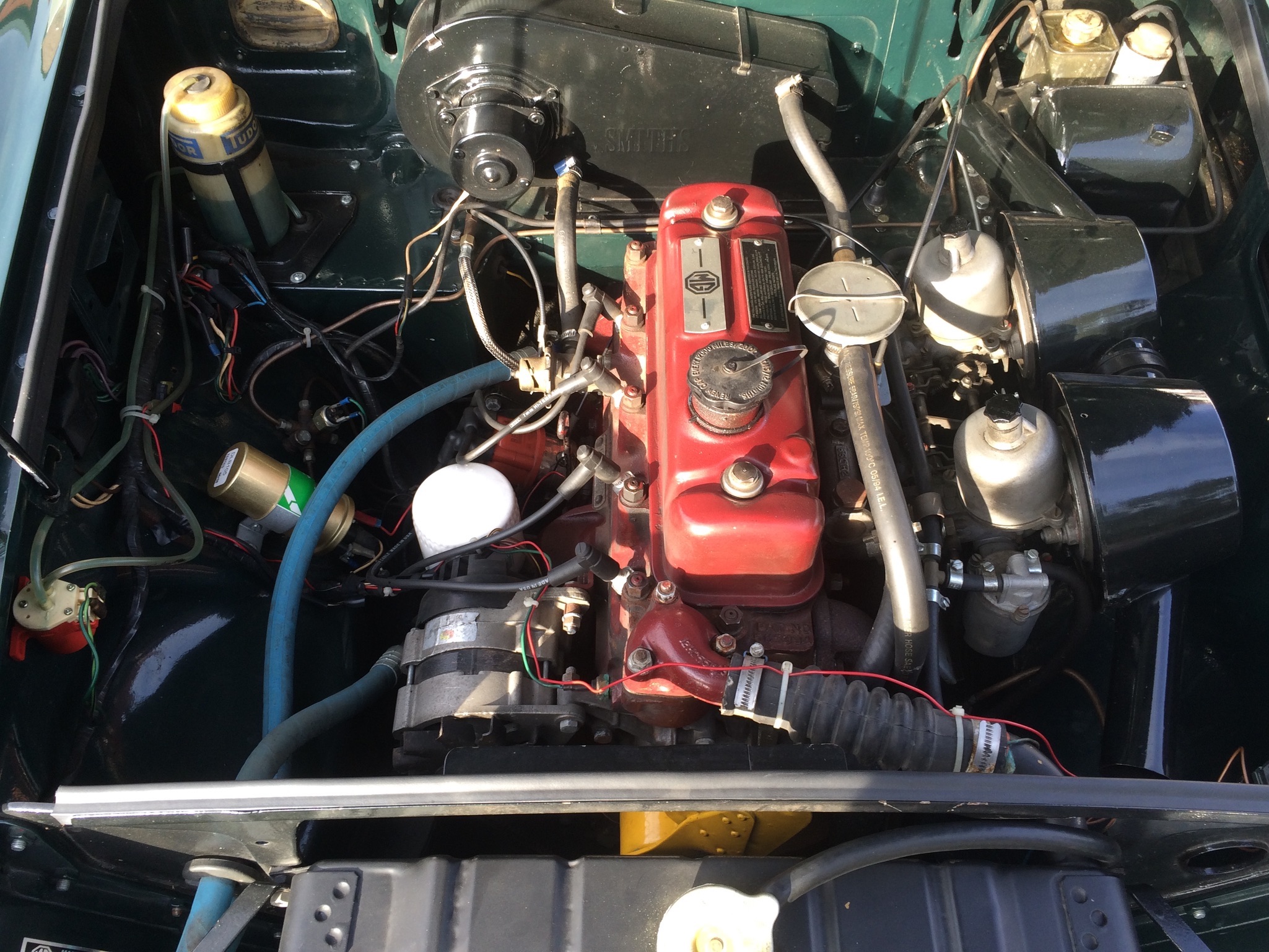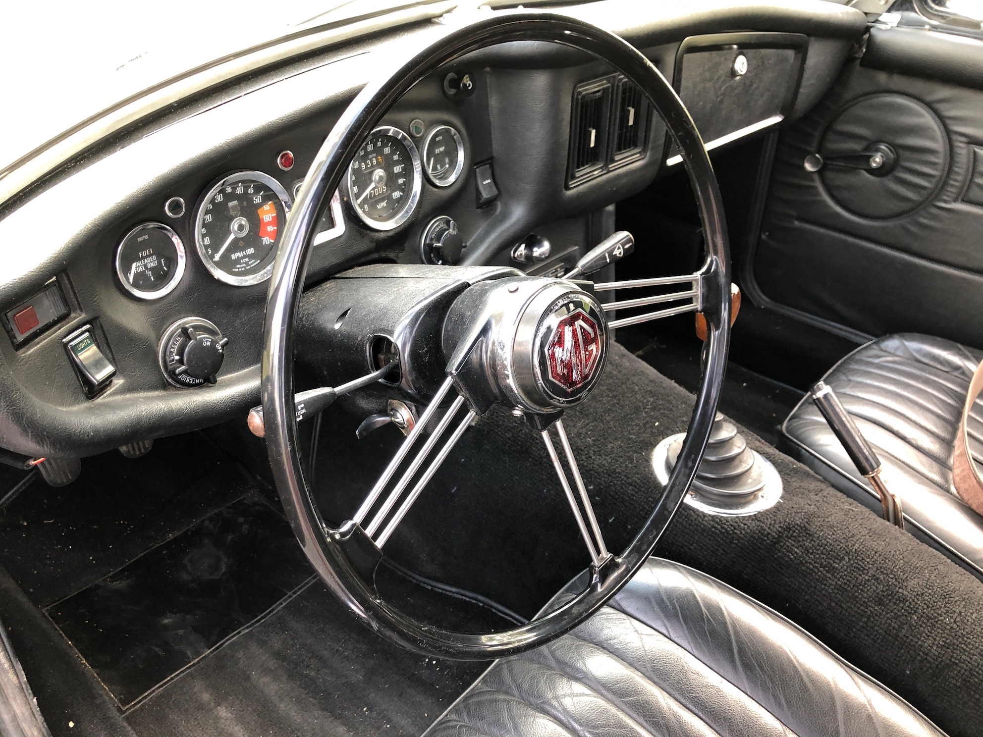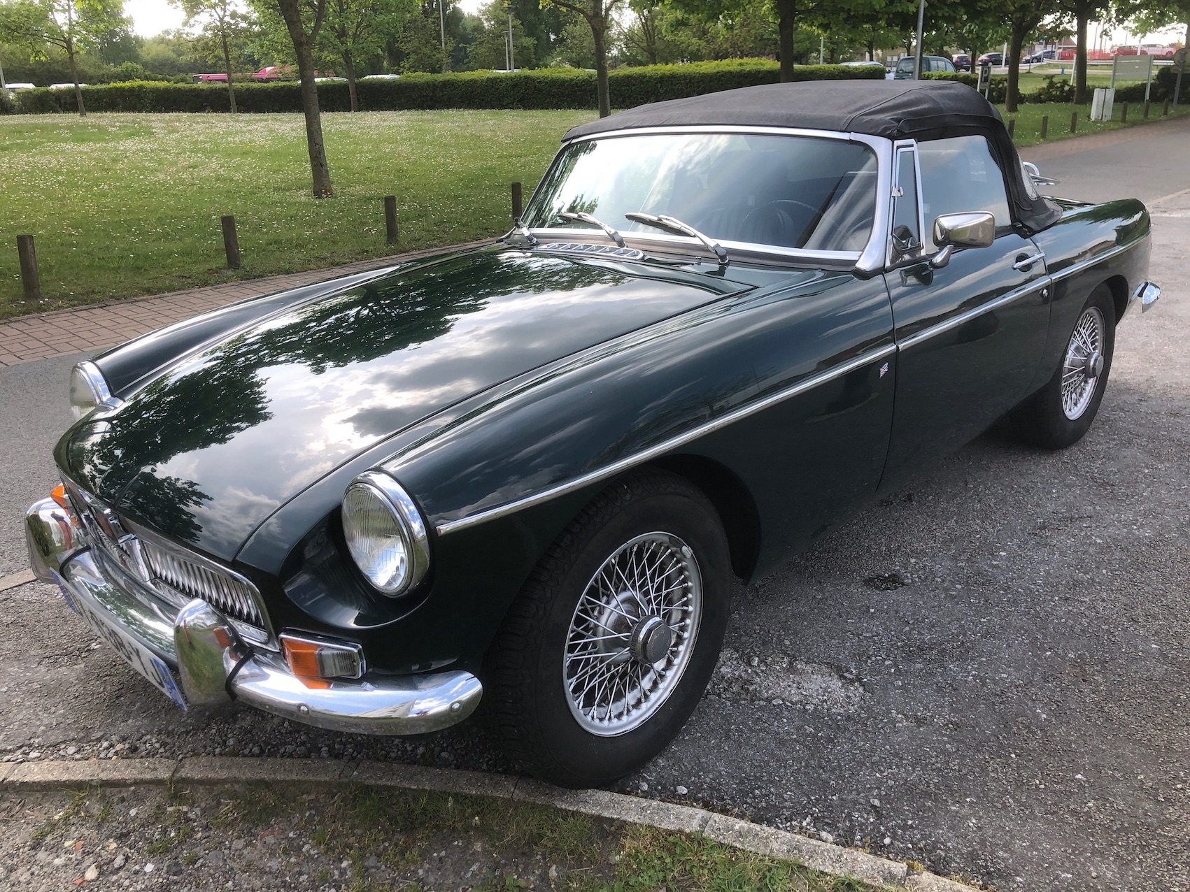 Vends MGB, cabriolet 1969, vert anglais, intérieur cuir noir, capote noire, No de série GHN5UA190758G, MKII, 1798 cc, 96 cv SAE, 78 cv DIN, overdrive, restauration complète « body off » entre 2005 et 2007, 78770 miles, bon état général.