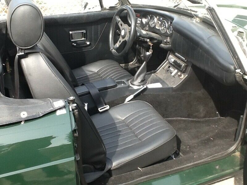 L’intérieur a été refait: sellerie et moquette neuves (sauf comptoir de bord). Deux sièges enveloppant en cuir noir « Suffolk Classic » (valeur de 2500 euros la paire) offrent un grand confort avec appui tête et ceinture de sécurité trois points. Deux haut parleurs « Infinity » encastrés à l’arrière avec un auto radio CD. Compteur en Kilomètres. Pommeau en bois.
