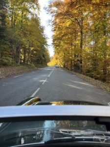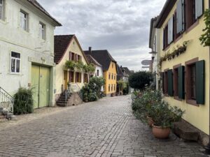 Haut Lieux du tourisme rhénan, les villages pavoisés se succèdent. Maison à colombages, hautes treilles, viticulteurs finissant leurs récoltes.. Un superbe traveling sous une météo favorable que nos amis avaient eu le goût d’inviter. L’usage de cabriolets permettait également de sentir dans les cours des fermes croisées l’odeur du vin nouveau fermentant dans les cuves. A notre droite la plaine allant jusqu’à la Forêt Noire et Heidelberg.