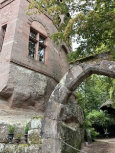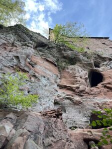 A gauche, dominant les vignobles, des pics, des châteaux de grès rouge. C’est justement l’un d’eux que nous découvrons lors d’une visite. Ceci nous permettant de grimper au sommet d’un éperon rocheux dans lequel murailles et pièces furent creusés. Une plongée dans l’histoire où dès le moyen-âge les châteaux en grès rouge des Vosges (que le romantisme adulera) se faisaient face de part et d’autres de cette frontière encore actuelle.