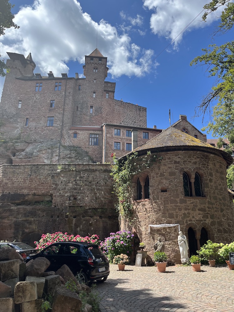 A gauche, dominant les vignobles, des pics, des châteaux de grès rouge. C’est justement l’un d’eux que nous découvrons lors d’une visite. Ceci nous permettant de grimper au sommet d’un éperon rocheux dans lequel murailles et pièces furent creusés. Une plongée dans l’histoire où dès le moyen-âge les châteaux en grès rouge des Vosges (que le romantisme adulera) se faisaient face de part et d’autres de cette frontière encore actuelle.
