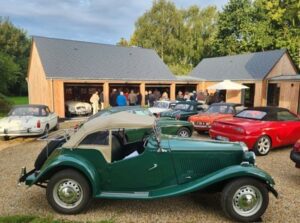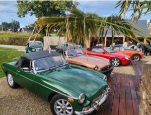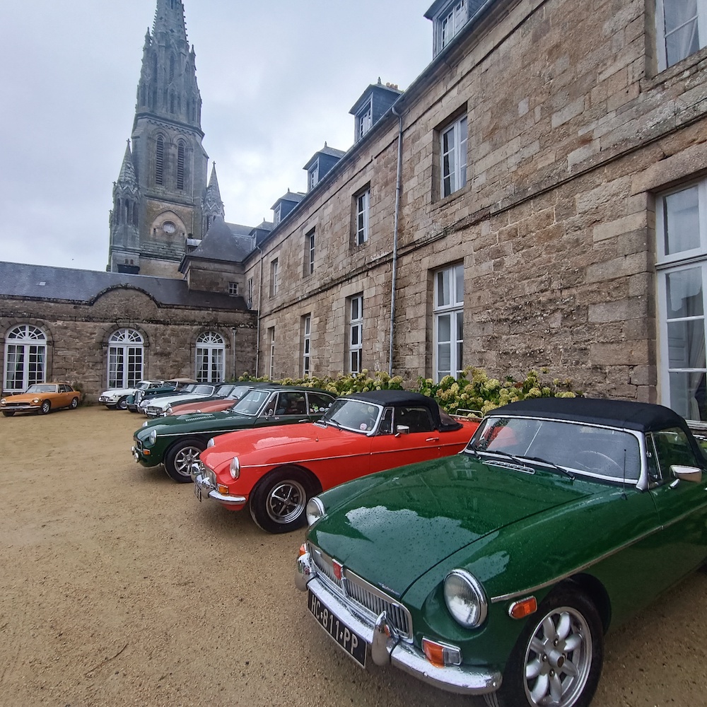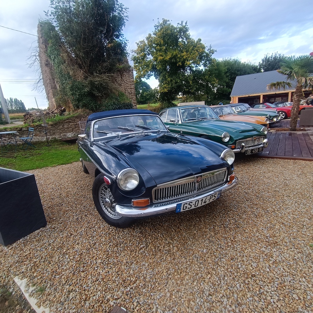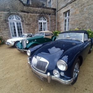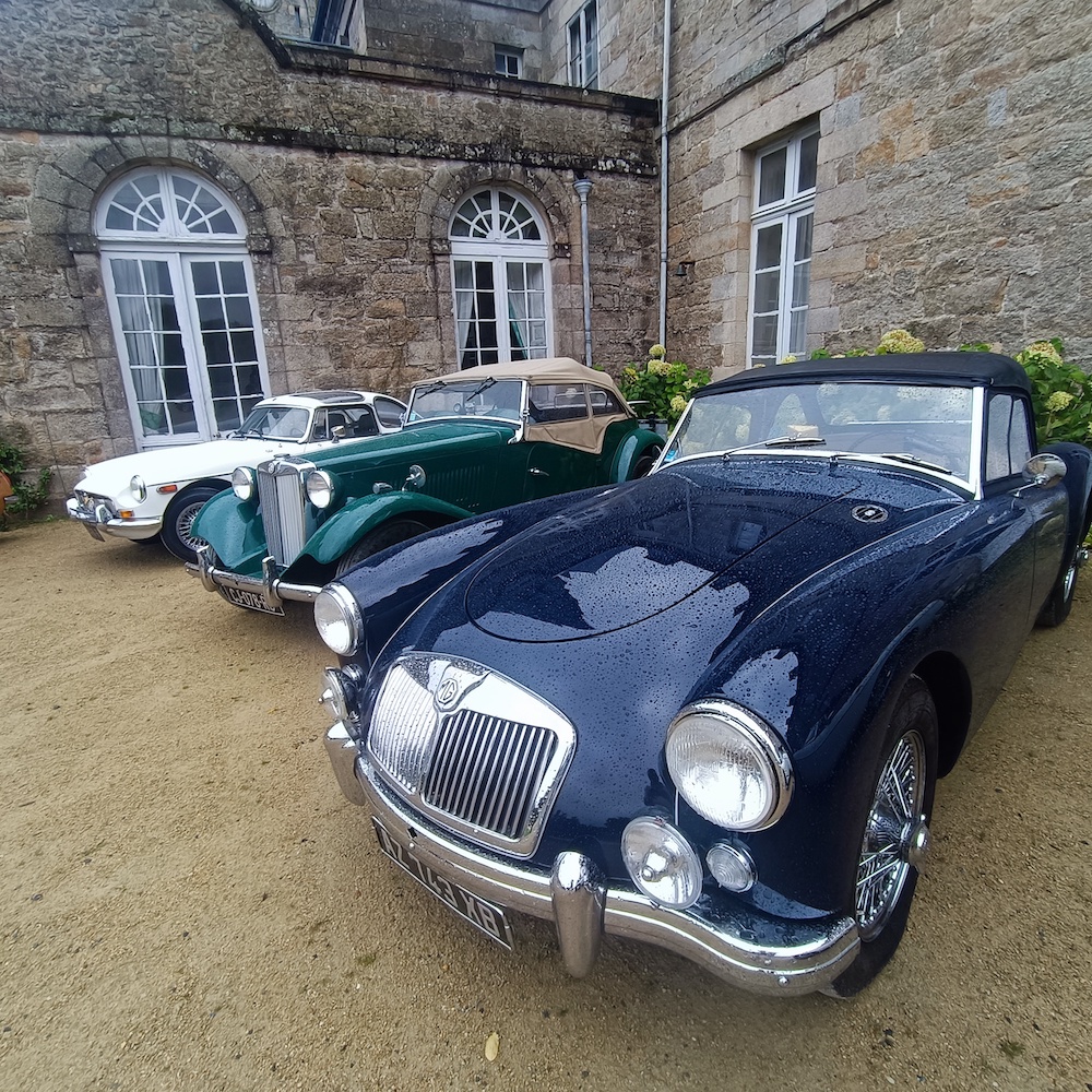 Nous quittons le parking à 9h pour une pause-café, croissants chez Régis de l’autre côté du barrage de la Rance. Ce dernier collectionneur passionné, nous reçoit à son domicile et nous permet d’admirer sa collection composée d’une MGA, une Austin Healey biton et deux Jaguars, une XK 120 et XK 140. Tout en dégustant notre croissant sans café, nous écoutions attentivement la présentation des modèles exposés.